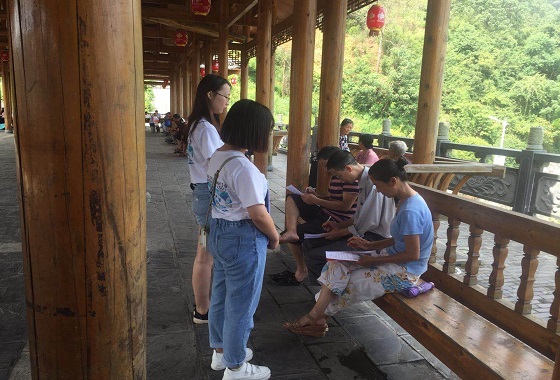 调研团一行首先与原大园村村长杨小聪取得了联系,在杨小聪的帮助下,调研团顺利完成了对大园古苗寨的走访调查。紧接着,调研团回到了绥宁县,团队成员兵分两路,分别去到绥宁县特色景点风雨桥与绥宁县县中心,继续开展问卷工作。
