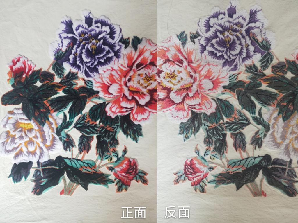 苗家插绣讲究一画,画面灵感来源于生活,展现苗族特色风情;二绣,讲究平心静气,针为苗家插绣特有自制空心针,在下针时,用力要均匀,针刺的深浅要到位,每针之间的间距要齐整;三剪,用剪刀将正面凸起绣线依图案需求按绣线颜色由深至浅修剪。周元桃告诉调研团,插绣最重要的是讲究明暗,深浅。明暗是对用色的考验,深浅则是对运针的把握。在坚持插绣的同时,周元桃积极参与各种培训活动,教习插绣的技巧与方法,助力插绣技艺更好的传承。