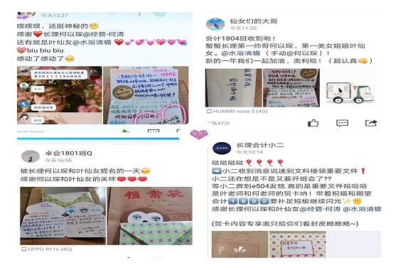 段懿珊老师通过为所有学生发晚安短信的形式,共同迎接2020年的到来。收到短信的学生,纷纷晒图表白自己的辅导员。“我上辈子是拯救了银河系,才会遇到这么暖心的辅导员么!”“收到信息说领重要文件,还在想是不是又要开班会了,奔过去发现还真是重要文件哈哈哈哈,是叶老师和何老师的贺卡呐!”