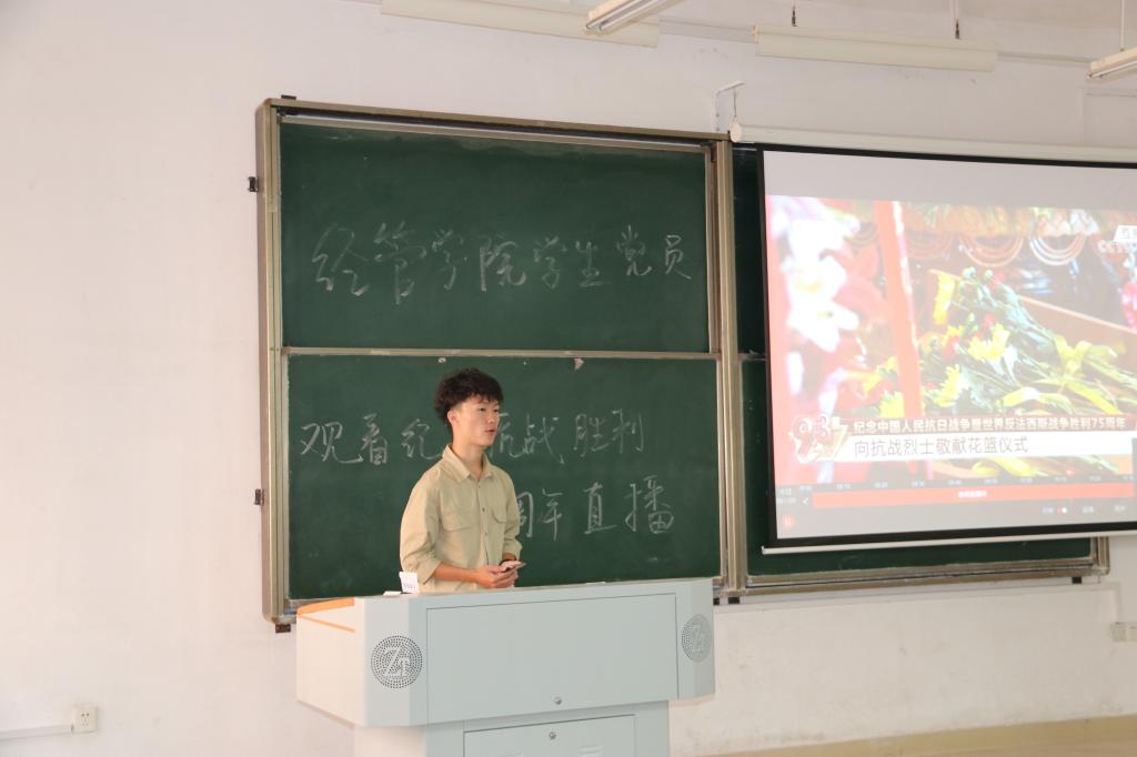 经管学院于9月3日上午组织学生党员及党建工作组学生干部在文科楼e101观看了中国人民抗日战争暨世界反法西斯战争胜利75周年纪念日直播。院党委书记王宏、院党委副书记唐青、党建辅导员叶鑫与学生一起观看了直播。