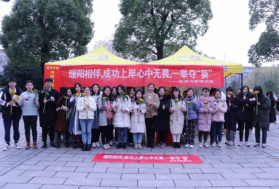 学院为考研同学精心准备了暖心礼品:一朵朵绽放的向日葵,意寓积极乐观,越战越勇,一举夺“葵”;一张张手写的明信片,送上来自同学和老师最诚挚的祝福;一杯杯温暖的姜茶,驱走冬日的寒冷和复习的疲惫,用最好的状态来应对即将到来的考试。同学们还在写有“暖阳相伴,成功上岸,心中无畏,一举夺‘葵’”祝福语的横幅上署上自己的名字,写下自己的美好心愿。学院领导老师也到现场和考研学子们谈心交流、合影留念,送上最美好的祝福,希望大家都考上心仪的学校。