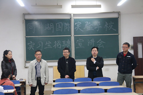 2018年3月25日晚7点,同升湖国际实验学校实习生招聘宣讲会在经管学院文科楼D101举行。同升湖国际实验学校副校长向赞勋、主任黄道河、年级主任罗鑫,经管学院党委副书记涂道勇出席本次宣讲会。