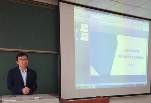2018年3月28日下午两点半,经管学院在金盆岭校区7-110举行14级金融专业就业座谈会。会议由经管学院就业专干计潇主持,学院党委副书记涂道勇、金融系主任尹筑嘉、年级辅导员计潇出席了此次会议。