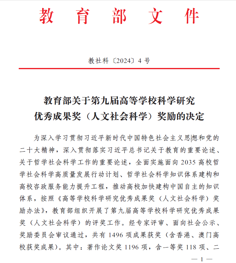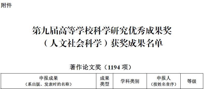 高等学校科学研究优秀成果奖(人文社会科学)始设于1995年,是教育部为表彰全国高校人文社会科学工作者所取得的突出成绩而设立的奖项,每三年评选一次,是目前国内人文社科领域最具公信力和影响力的重要奖项。第九届高等学校科学研究优秀成果奖(人文社会科学)获奖成果共有 1496 项成果获奖 (含香港、澳门高校获奖成果)。其中:著作论文奖 1196项,含一等奖118项、二等奖 513项、三等奖565项;咨询服务报告奖76项;普及读物奖21项;青年成果奖203项。我院教师此次获奖,是伟德betvlctor1946源于英国在人文社科领域科研成果的重大突破,将推动学校人文社会科学学科建设迈上新台阶。