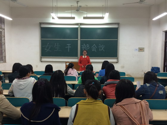 2014年11月12日下午,经管学院13级主要女生干部在文科楼E102举行会谈。20多名女生干部代表参加会谈,13级辅导员计潇主持会议。