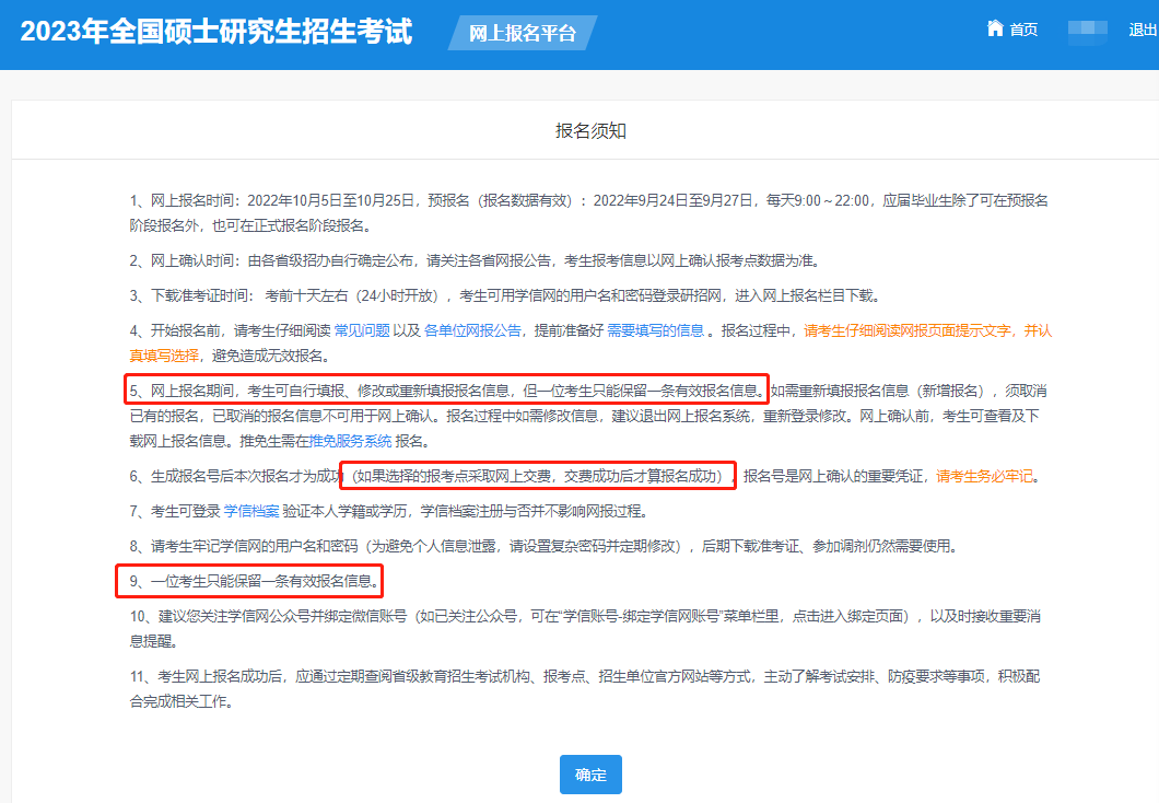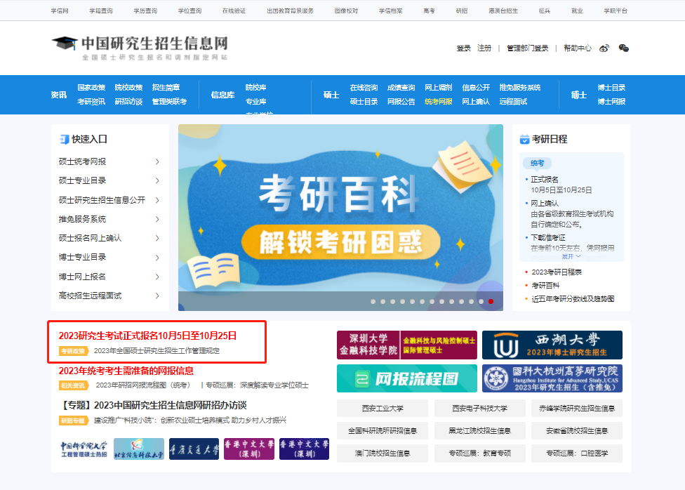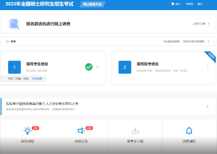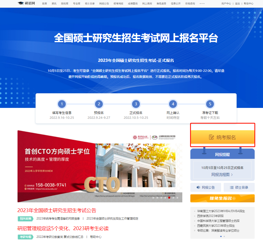 (一)网上报名:1.报名时间:2022年10月5日至10月25日,每天9:00-22:00。2.请在规定时间登录“中国研究生招生信息网”(以下简称“研招网”)浏览报考须知,并按教育部、省级教育招生考试机构、报考点以及报考招生单位的网上公告要求报名。公网网址:https://yz.chsi.com.cn教育网址:https://yz.chsi.cn3.考生应当认真了解并严格按照报考条件与相关政策要求填报志愿及选择报考点。因不符合报考条件及相关政策要求造成后续不能网上确认、考试(含初试和复试)或录取的,后果由考生本人承担。4.报名期间,考生可自行修改网上报名信息或重新填报报名信息,但每位考生只能保留一条有效报名信息,逾期不再补报,也不得修改报名信息。5.报名期间将对考生学历(学籍)信息进行网上校验。考生可上网查看学历(学籍)校验结果,未能通过学历(学籍)网上校验的考生,必须在网报结束前完成学历(学籍)核验。