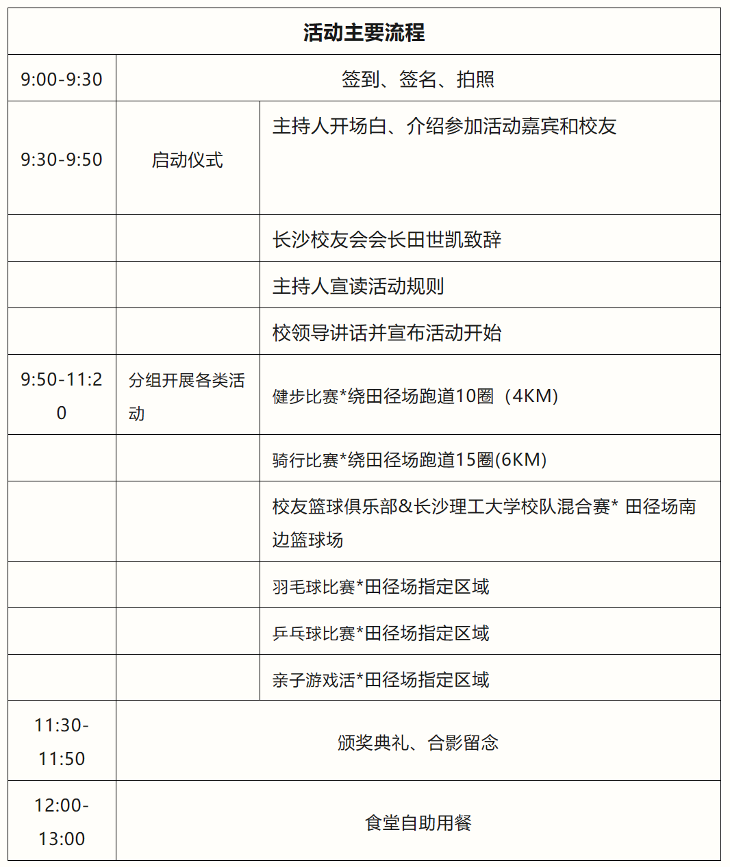 健步行活动(校内)由长沙校友会具体组织实施,于2023年5月20日上午9:00在伟德betvlctor1946源于英国金盆岭校区田径场开始签到,随后开展健步行等体育娱乐活动。参与者可选择骑自行车、健步行、篮球、羽毛球、乒乓球、亲子游戏等活动。场地安排为: