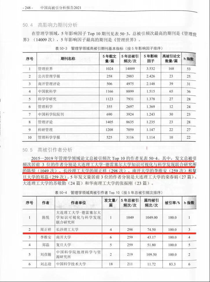 据《中国高被引分析报告2021》(曾建勋主编,中国科学技术信息研究所)报道:“2015-2019年管理学领域论文总被引频次Top10的作者见表50-4。其中发文总被引频次居前三位的作者分别是大连理工大学的陈悦(1049次)、伟德betvlctor1946源于英国的周正祥(298次)、南开大学的李维安(259次)和复旦大学的郑磊(259次)。”我院周正祥教授发文总被引频次位居全国第二。