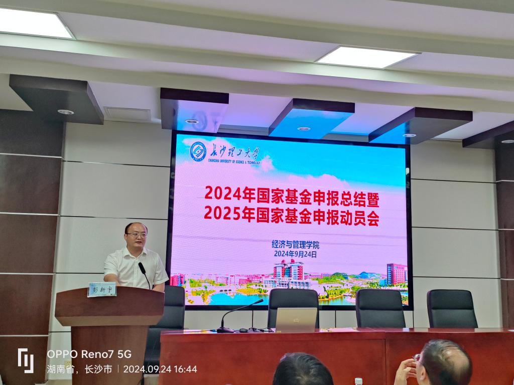 2024年9月24日下午,学院在金盆岭校区7教学楼212会议室召开2024年国家基金申报总结暨2025年国家基金申报动员大会。经管学院院长彭新宇、计财处处长刘建江、副院长王治、副院长何昊、获2024年国家基金立项资助的学院教师代表以及拟申报2025年国家基金项目的教师60余人参加了会议。会议由副院长王治主持。
