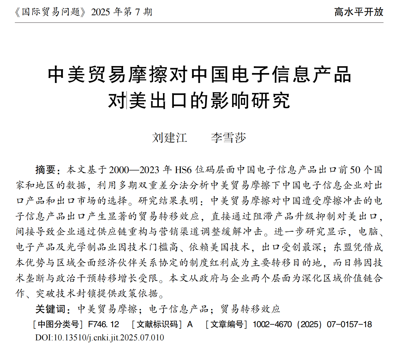 近日,我院刘建江教授和硕士研究生李雪莎的论文《中美贸易摩擦对中国电子信息产品对美出口的影响研究》在《国际贸易问题》2025年第7期正式发表。该文亦为国家社科基金重点项目“高百年未有大变局下美国对华贸易政策新变化与中国对策研究”(22AJL009)的阶段性成果。