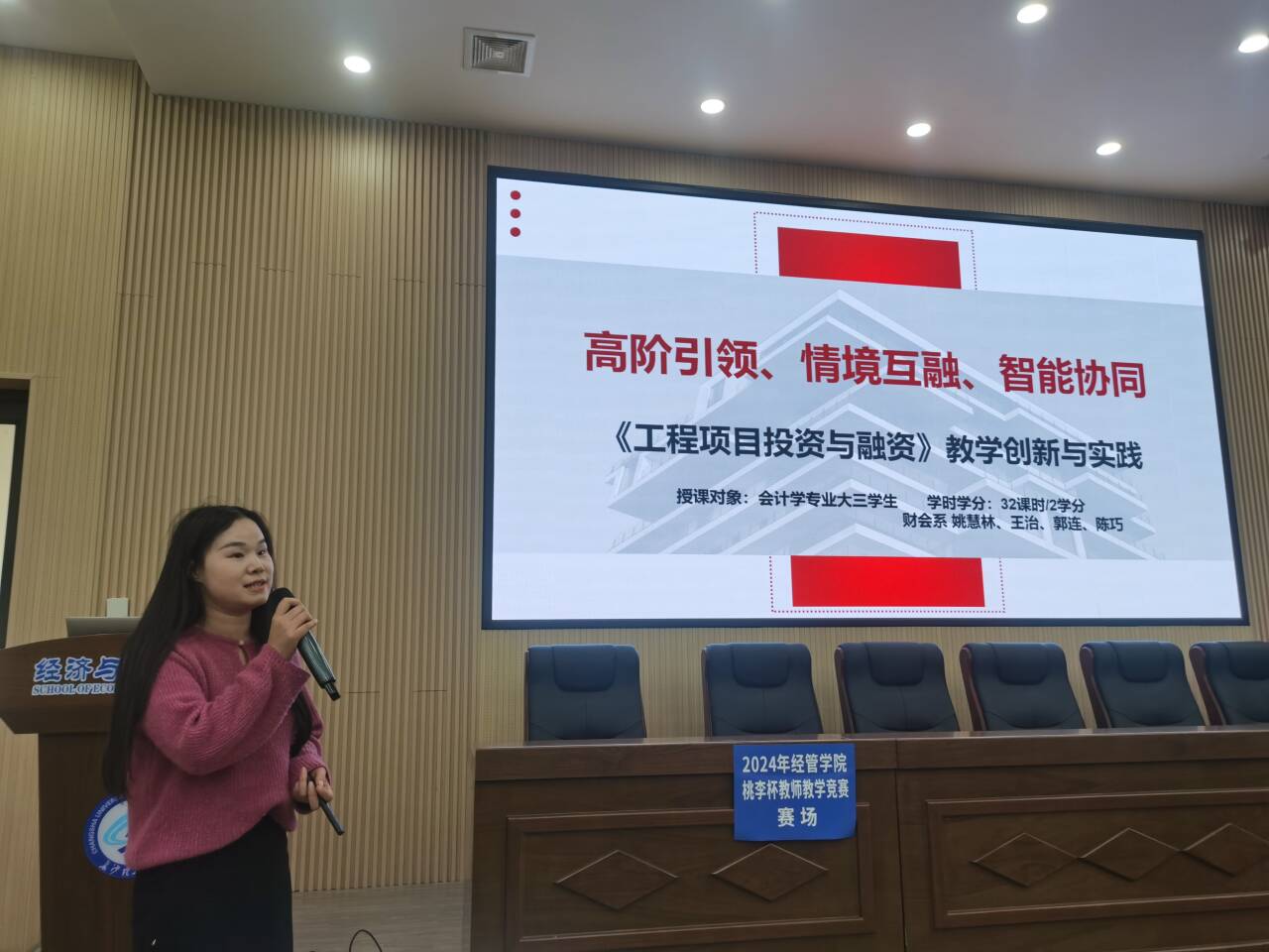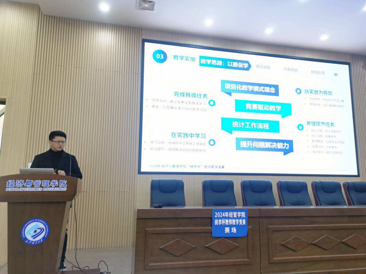 2024年12月15日下午14时,经管学院举行“桃李杯”教师创新教学竞赛现场赛,共有14个教学团队参加了本次竞赛。何昊副院长致开幕词,李祝平、曾志华、尹国君三位老师应邀担任竞赛评委,约50名教师现场观摩了比赛。