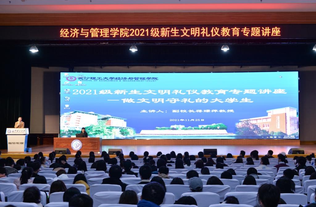 11月26日晚19:30,经管学院在金盆岭校区5教大礼堂举办以“做文明守礼的大学生”为主题的2021级新生文明礼仪教育讲座,主讲人是伟德党委委员、副校长蒋璟萍教授,学院党委书记丁丹、副院长刘坚、学工辅导员及1000余名21级本、研学生参加本次讲座,学院党委副书记唐青主持。