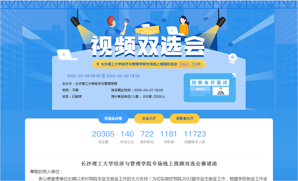 本次视频双选会共审核通过参会企业140家,涵盖制造业、金融业、房地产业、建筑业、信息传输、软件和信息技术服务业等多个领域,提供招聘岗位722个,多方位满足我院毕业生的就业需求。云就业平台数据显示本次视频双选会浏览总量为20246次,参与应聘的毕业生1181人,共投递简历1181份,一些同学通过视频面试与用人单位达成了就业意向。