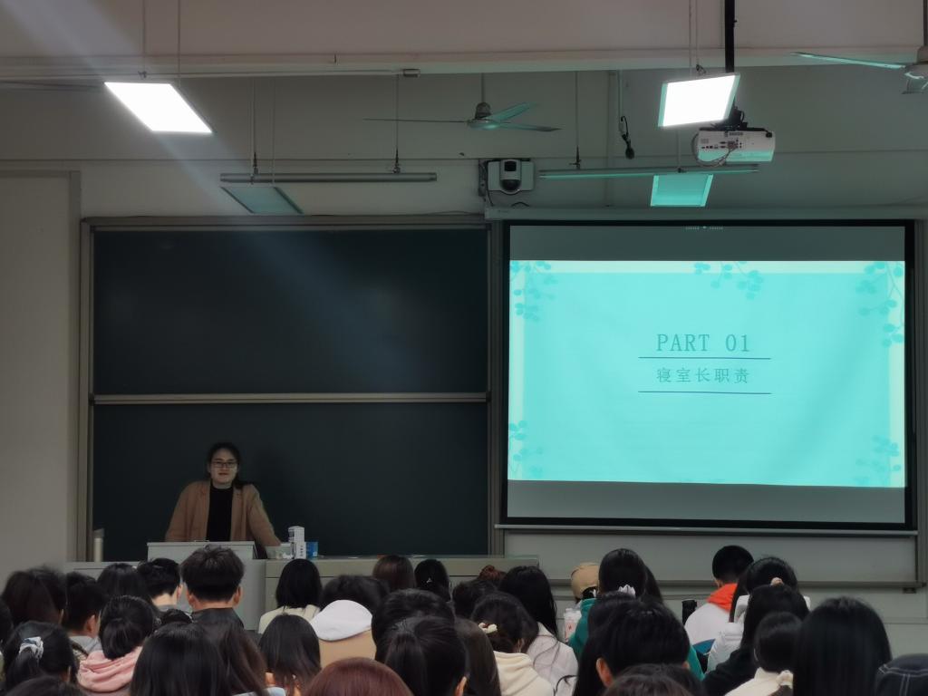 会议伊始,何艳芝提出了寝室长的“角色集”,并强调了寝室长的职责,呼吁寝室长起好榜样作用,共同营造和谐健康的寝室氛围;同时,对本学期第一周的内务检查情况进行了通报,阐述了宿舍内务与检查的内容。强调寝室安全的重要性,从用电安全、财产安全、防疫安全、人身安全等方面进行展开,并对晚上晚点名工作进行布置;提出寝室长应当主动关注寝室成员的心理健康,树立正确的心理健康认知、识别心理问题,并提倡要以“理解、关心、包容”的心态对待。