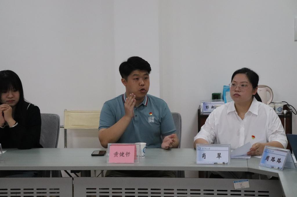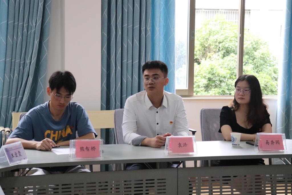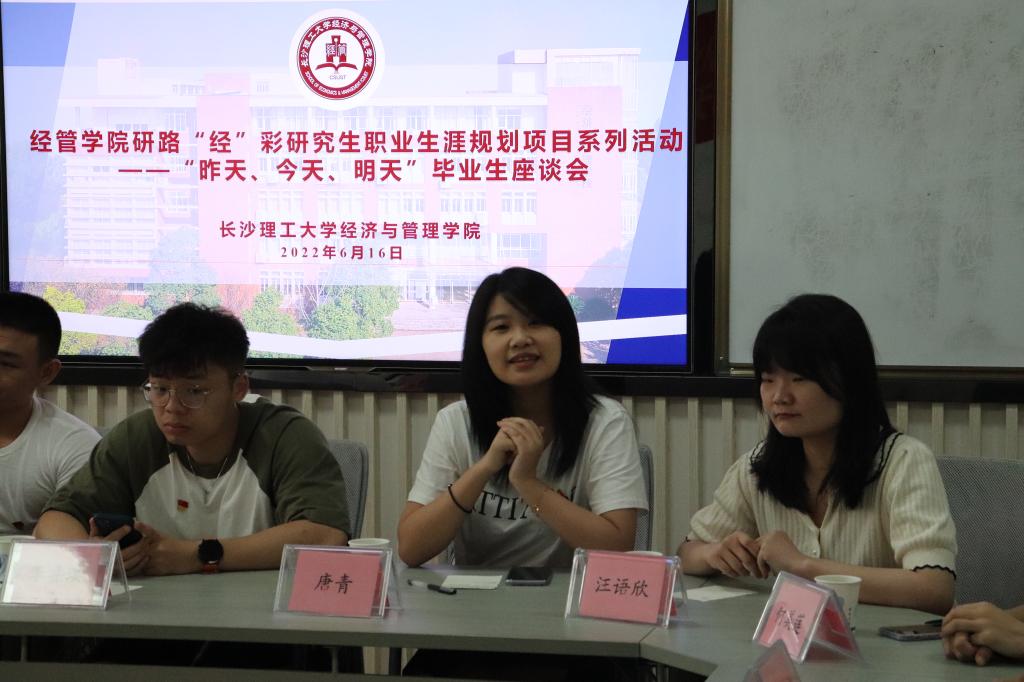2022年6月16日上午9:30,我院研究生职业生涯规划项目系列活动之毕业生座谈会于金盆岭校区七教206教室举办,经管学院党委书记丁丹、关工委常务副主任陈均杰、副书记唐青、副院长王治、研究生培养办主任王宏霞、学工办主任周路路、研究生辅导员肖翠出席了此次会议,会议由研究生辅导员肖翠老师主持,我院19级管理班黄健哲、19级会计专硕班张安宇等各专业毕业生代表参会,座谈会伊始,辅导员肖翠老师首先代表学院向2022届毕业生顺利毕业表示衷心祝贺,并向大家介绍了座谈会的主要议程。