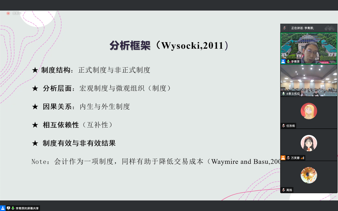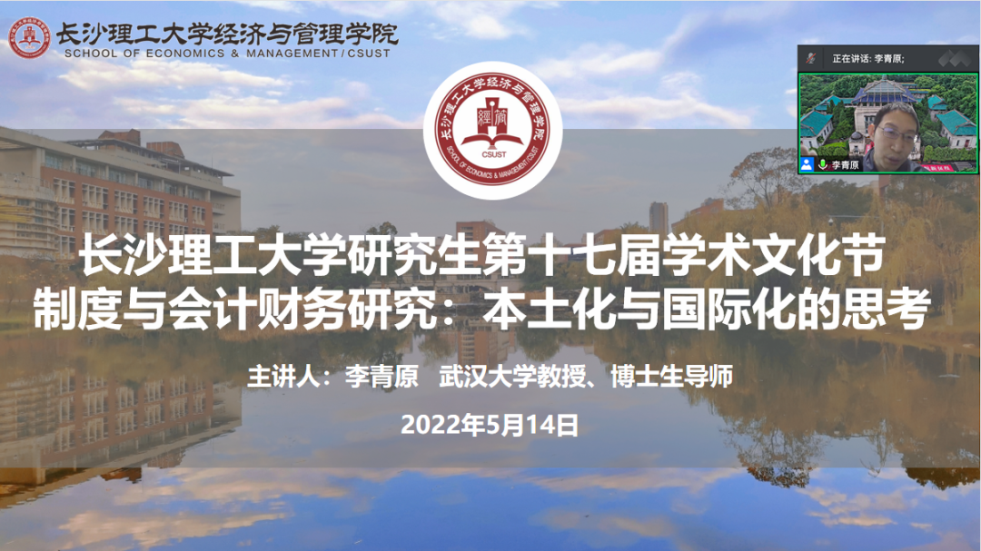 2022年5月14日15:00,经管学院邀请了武汉大学经济与管理学院李青原教授为我院师生做了题为“制度与会计财务研究:本土化与国际化的思考”的学术讲座。讲座采取线上及线下相结合的方式进行,副院长彭新宇、学院部分老师和研究生共计200余人聆听了此次讲座。此次讲座由副院长王治教授主持。