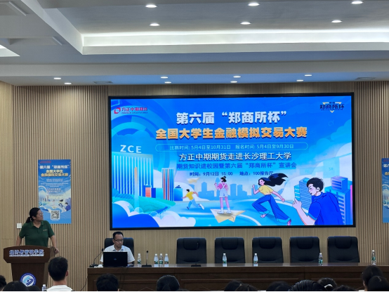 讲座伊始,范辰向大家介绍了本次期货知识宣讲会的主旨、意义及计划,期望以此为给师生搭建一个与企业的杰出管理者近距离交流的平台,开拓商科师生的思维与视野,并鼓励同学们积极参加第六届“郑商所杯”全国大学生金融模拟交易大赛。