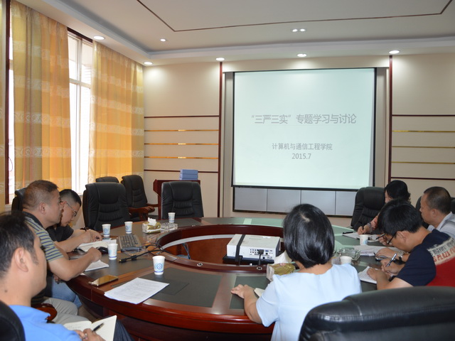 计通学院党委中心组分别于2015年7月6日和9月18日在理科楼B502开展了“三严三实”专题教育第一、二专题的学习与研讨交流。专题一重点围绕严以修身、加强党性修养、坚定理想信念、把牢思想和行动的“总开关”开展研讨交流,专题二重点围绕严以律己、严守党的政治纪律和政治规矩、自觉做政治上的“明白人”开展研讨交流。中心组开展专题学习与研讨交流以来,一次比一次更深入、更自觉、更认真,联系实际更多了,给人以启示和教育。通过进一步的学习与研讨交流,成员们表示在巩固教育实践活动成果中、在推动学校改革发展和加强政治思想作风建设中将努力践行“三严三实”,把“三严三实”作为正心修身的重要守则、干事创业的行动准则,以“三严三实”的作风投身学校深化改革实践中,更好的履职尽责,为加速学校发展不懈努力。