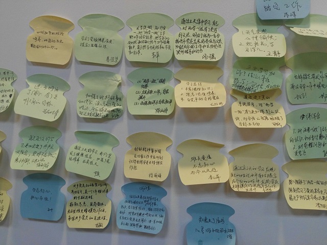 交流会前两天,十个研讨小组都就自身党性修养不强的问题进行了认真的剖析和深入的讨论,每个小组总结出5条党性修养不强的表现写在便签条上,贴到公布墙上。交流会上,每个小组还就讨论结果形成了发言稿,进行了5分钟的发言, 并由下一组的点评人进行点评。党员们普遍认为,党的理论知识修养不够、业务学习能力不强、缺乏担当精神、自我要求有所降低是我们教师党员中存在的问题。党员们也表示,在以后的工作中要加强理论学习,多向优秀党员和优秀教师看齐,要敢于自我挑战,提升科研能力,同时,加强教书育人意识,不让一个学生掉队,将抓学风,抓教学落到实处。