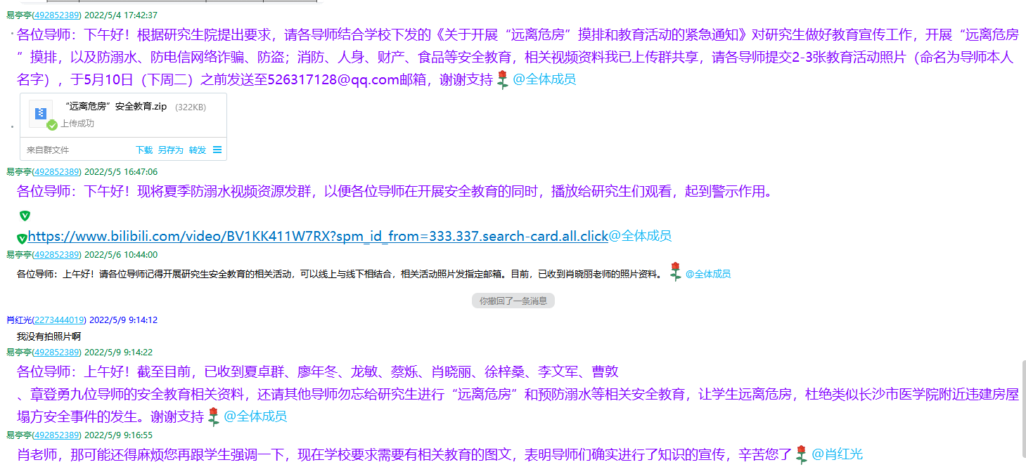 学院研究生辅导员在研究生导师群里面下发通知,要求落实导师责任制,对研究生开展“远离危房”摸排,以及防溺水、防电信网络诈骗、防盗;消防、人身、财产、食品等安全教育。导师们积极分配,利用线上和线下对全体研究生召开“‘远离危房’摸排和教育”相关组会,组织研究生认真观看学习了“生命重于泰山——学习习近平总书记关于安全生产重要论述”电视专题片,以及开展了对新修订《安全生产法》的学习。导师们排查了研究生五一假期返校情况,教育引导广大研究生坚决远离危房,禁止到校园周边各类安全条件不具备的场所特别是违章非法建筑物内聚集玩耍或消费。针对研究生外宿、外租房等情况进行全面摸排,引导研究生非必要不外租房,对于办理了相关手续的外租房研究生,在详细掌握研究生居住环境的基础上排查是否为违章非法建筑物,是否存在安全隐患,并做好相关工作。