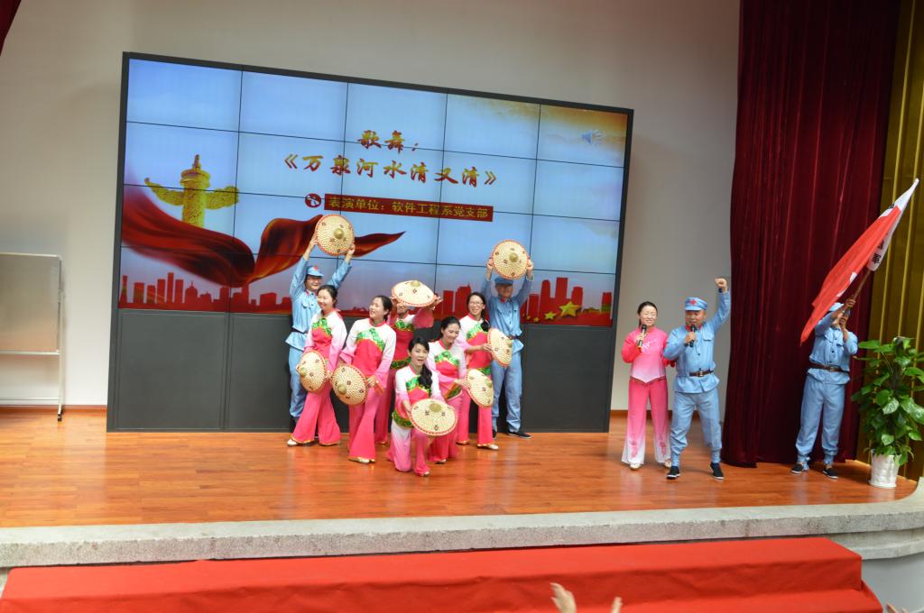 演出中,全院党员和教职工精神饱满、激情澎湃,个个上台倾情参演。软件支部歌舞《万泉河水清又清》教师们轻盈优美舞姿中学院教授委员会主席傅明教授的精彩领唱,学院党校学员温情的手语表演《国家》,网络支部合唱《没有共产党就没有新中国》中青年教师熊兵女儿童声情景剧的参演,青年工作部《如果我在长理遇见你》如诗如画的朗读,研究生支部歌舞《绣红旗》演员们稚嫩可爱真实的表情,行政支部配乐诗朗诵《不忘初心跟党走》方琼书记和王任飞副书记激情坚定的领诵,计应和实验中心支部大合唱《我的祖国》、《歌唱祖国》分声部的柔美动听,计科和通信支部大合唱《保卫黄河》和《团结就是力量》的气势磅礴等等精彩的亮点,给整个会场带来了经久不息的掌声,给观众带来了一场党的教育的盛宴,更加凝聚了人心,更加坚定了广大党员和教职工团结一致跟党走的理想信念!(文\汤晓霞 图\李进)