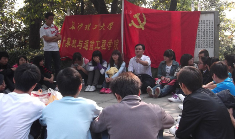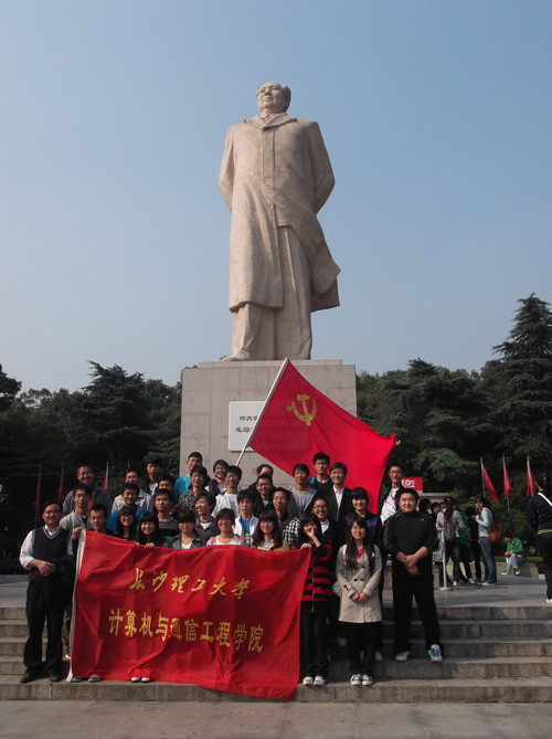 早上8点半,学员们从云塘出发,10点到达东方红广场,全体学员在毛主席的雕像下合影留念。10点半左右,在伍接朝老师的带领下,活动负责人谭飞刚、佘灿、何克岩、席斌同学组织全体学员代表开始登山。一路上,伟德betvlctor1946源于英国计通学院的院旗和中国共产党的党旗在登往岳麓山的路上随风飘扬,形成了一道亮丽的风景线。尽管山路崎岖漫长,同学们却兴致勃勃,一路上有说有笑,非常热闹。经过将近40分钟的跋涉,全体学员代表到达黄兴墓前。在整理好队伍后,入党积极分子培训班班长席斌向同学们简单的介绍了黄兴的生平事迹,党校助理班主任谭飞刚同学带领全体学员代表高举拳头,在黄兴墓前,面对中国共产党党旗庄严宣誓。下午1点左右,伍老师组织学员们进行座谈,同学们在黄兴墓边席地而坐,围成一个圈,把零食当做午餐,一边吃着零食一边开始进行交流,来自学院本科生四个年级和研究生两个年级,计算机、通信、网络和软件四个专业的入党积极分子以及预备党员们在此刻就像亲密的一家人。伍老师向大家说明了此次来岳麓山的意义,简要的介绍了辛亥革命的和中国共产党历史,并带领大家学唱《国际歌》。在伍老师的带动下,同学们纷纷上场表演节目,交流活动一直进行到下午3点。