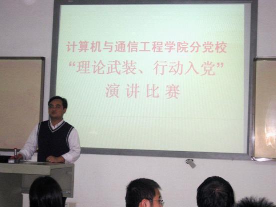 11月29日下午,计算机与通信工程学院在综合教学楼B401教室举办以“理论武装,行动入党”为主题的演讲比赛,来自学院第十八期入党积极分子培训班13个小组的13名同学参加了比赛,学院学工办主任伍接朝老师及各学生党支部书记担任评委。经过激烈的角逐,王雨威同学获得一等奖,唐文芬、曾鹏骁同学获得二等奖,谭艳群、刘子垒、彭岑昕、韩正旭四名同学获得三等奖。