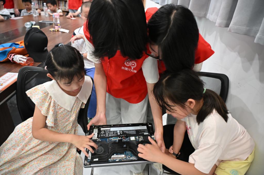 紧接着,“勇松”IT志工服务团成员林庆带领孩子们开展了一场生动的计算机硬件探索活动。她首先用形象化的语言讲解了主机、键盘鼠标、显示器、音响四大核心硬件的功能。为了让孩子们有更直观的认识,志愿者们现场拆解了一台笔记本电脑,展示内部结构,这一环节激发了孩子们浓厚的好奇心。随后,活动通过“击鼓传花”知识抢答和“硬件拼图”计时挑战等互动游戏巩固学习成果,孩子们踊跃参与,现场气氛热烈。