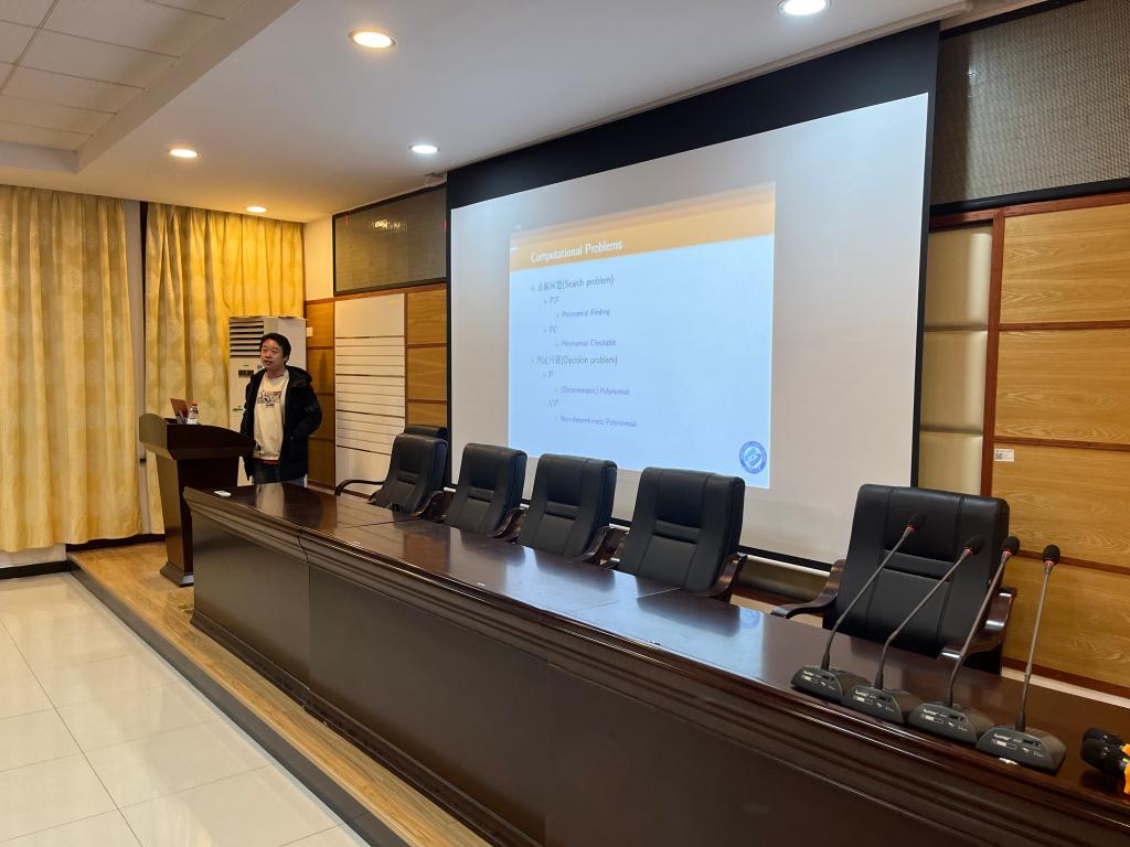 会议开始,由主持人余秋林简单介绍了张煌老师,并对张煌老师的到来表示热烈欢迎。张煌老师也对我院师生的到来表示感谢。随后,他重点从计算复杂度的求解问题、计算复杂度的判定问题、零知识证明等多个方面的内容展开了详细介绍。首先,张煌老师为我们简单介绍了NP问题,并对NP问题进行了举例讲解。随后,张煌老师引入了NP证明系统的概念,多项式时间算法V以s,w∈{0, 1}∗为输入,输出0或者1,此时V称为NP关系R的NP证明系统,且其需要具有完备性和稳固性。他还为我们展现了NP的知识复杂性,介绍了零知识证明的概念并通过一个例子让大家更生动地理解。零知识证明实质上是一种涉及两方或更多方的协议,即两方或更多方完成一项任务所需采取的一系列步骤。零知识证明必须包括两个方面,一方为证明者P,另一方为验证者V。证明者试图向验证者证明某个论断是正确的,或者证明者拥有某个知识,却不向验证者透露任何有用的消息。零知识证明目前在密码学中得到了广泛的应用,尤其是在认证协议、数字签名方面。
