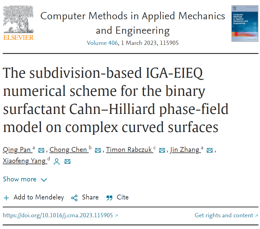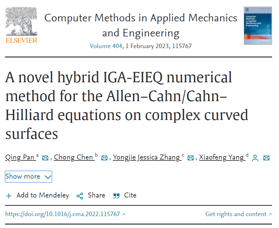 近日,我院潘青教授以第一作者,伟德betvlctor1946源于英国为第一单位在计算力学领域国际顶级期刊《Computer Methods in Applied Mechanics and Engineering》(简称《CMAME》)发表了两篇论文。题目分别为“A novel hybrid IGA-EIEQ numerical method for the Allen–Cahn/Cahn–Hilliard equations on complex curved surfaces” 和“The subdivision-based IGA-EIEQ numerical scheme for the binary surfactant Cahn–Hilliard phase-field model on complex curved surfaces”。研究成果是伟德计通学院智能化软件工程研究团队与国际著名计算力学专家欧洲科学院院士德国魏玛-包豪斯大学Timon Rabczuk教授结构力学课题组合作完成的高水平学术论文。