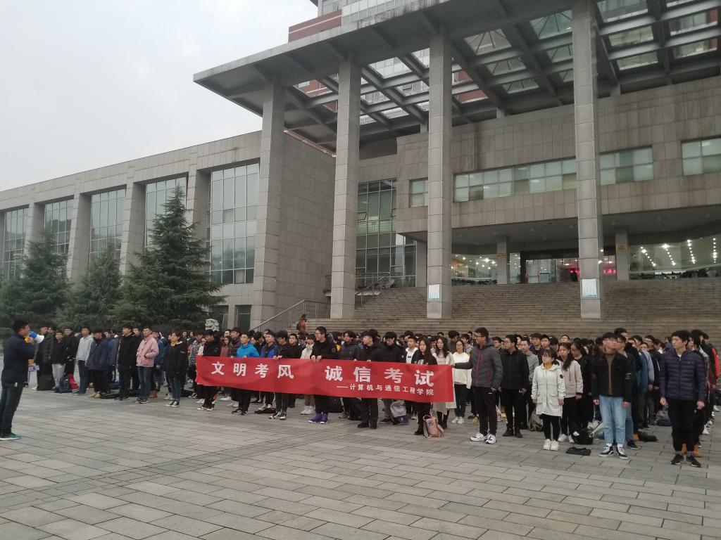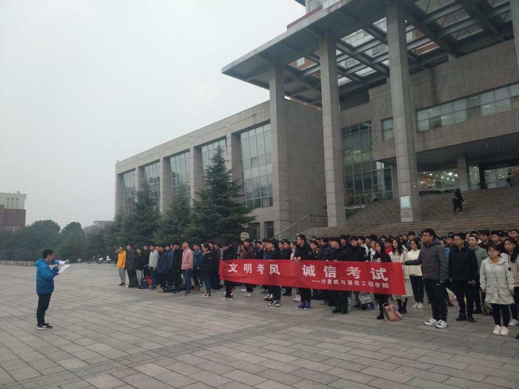 为加强学风建设,严肃考风考纪,12月16日早晨,计算机与通信工程学院18级学生和其他年级学生代表在图书馆前开展了期末考试动员活动,全体学工老师参加了动员活动。