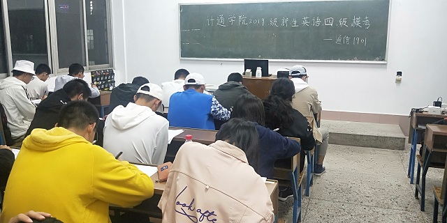 10月12日19:00-21:10,计通学院2019级在金盆岭校区13号教学楼组织开展了新生英语四级模拟考试。