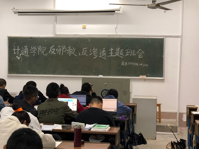 10月20日晚7:30,计通学院2019级新生在金盆岭校区各班晚自习教室召开“反邪教,反渗透”班会活动。