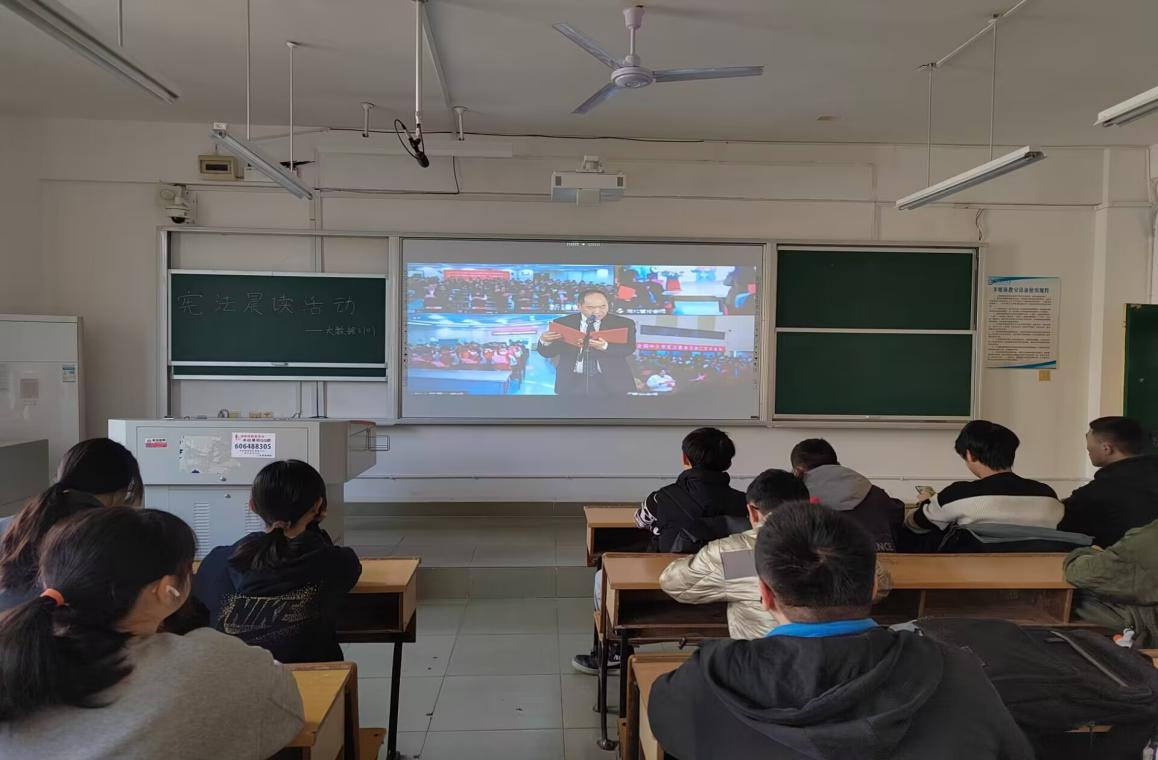 12月4日上午9:30,我院组织百余名计通学子线下集中观看国家宪法日教育系统“宪法晨读”活动在线网络直播。活动伊始,全体学生跟随直播同步举行了升旗仪式。随后,教育部领导在网络端主会场领读宪法部分条款,全体学生进行跟读。接着,网络端主会场领唱《宪法伴我们成长》歌曲,全体学生也进行了歌曲跟唱,现场气氛庄重严谨。最后,组织全体学生认真观看了第八届全国学生“学宪法、讲宪法”活动全国总决赛演讲比赛优秀选手展演,仔细听取了教育部领导讲话等。直播活动结束后,数名学生代表纷纷上台分享学习心得,并积极表态自己要做一名遵纪守法的计通学生和中国好公民。