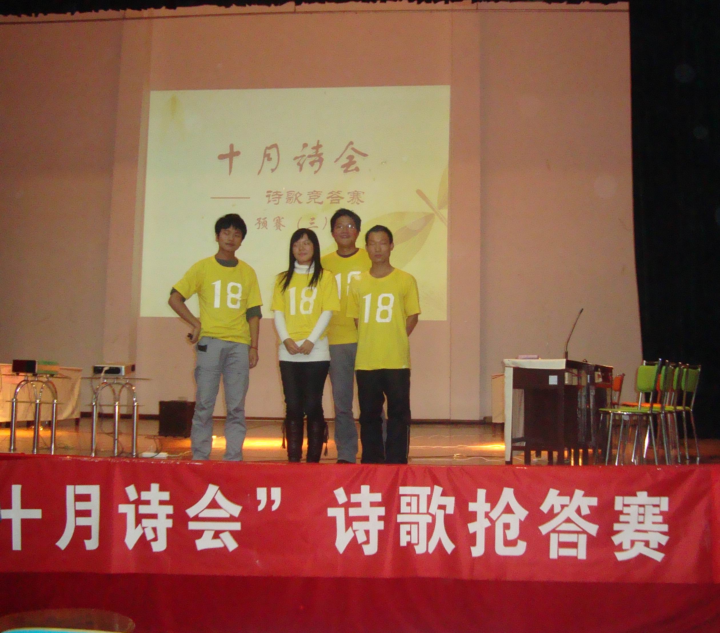 10月14日晚7点,伟德betvlctor1946源于英国2010年“十月诗会”诗歌抢答赛预赛在学生活动中心报告厅落下帷幕。计通学院在与土建学院、电气学院、外国语学院、化生学院的激烈竞争中崭露头角,获得本场比赛的第一名,成功晋级10月19日的决赛。