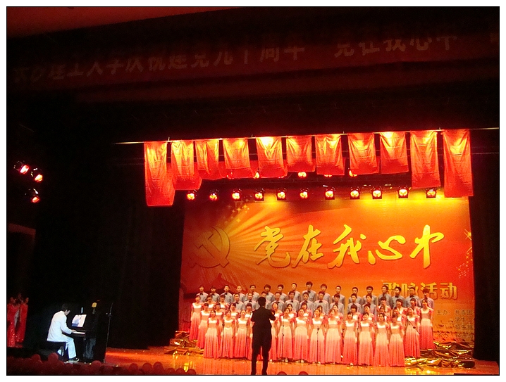 6月7日晚上7:00,长沙理工大学学工系统庆祝建党九十周年“党在我心中”歌咏比赛在云塘校区大礼堂举行,我院组织了60余人的合唱团参加了比赛。