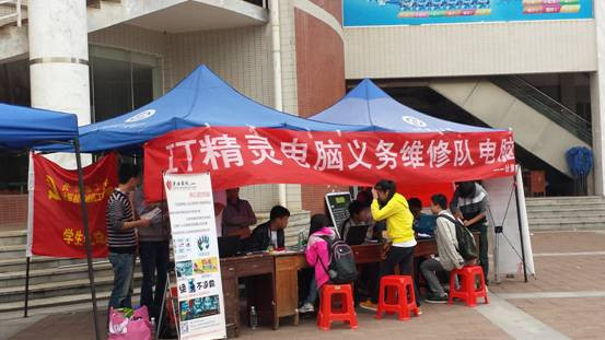 我院青志协的志愿者们在甘怡园前坪给送来检修的电脑进行检修,并耐心解答同学们的相关问题。从同学们一开始的愁容满面,到电脑修好时的喜悦,都让志愿者感到助人快乐的开心与满足。