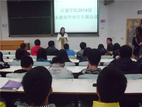 11月27日下午,计通学院在金盆岭6教107教室组织召开2014届未就业毕业生专题会议。学院就业专干邵巧艳老师、黄黎明老师,毕业生辅导员聂静老师出席,2014届未就业毕业生参加。