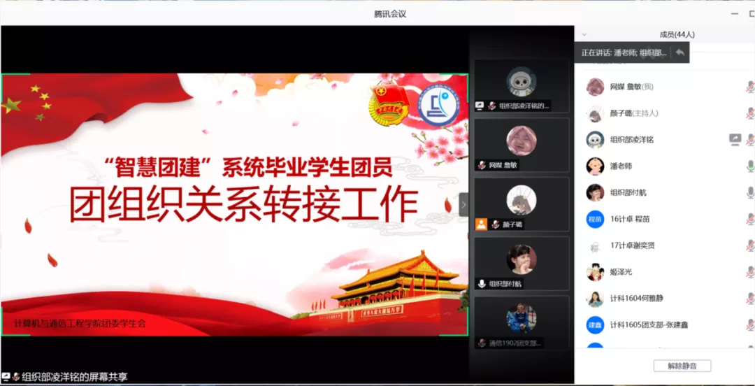 6月3日晚,计通学院团委在腾讯会议上召开了线上团支书会议。本次会议由组织部副部长付航主持,计通学院全体团支书参与。院团委书记潘枝花出席并作工作部署。