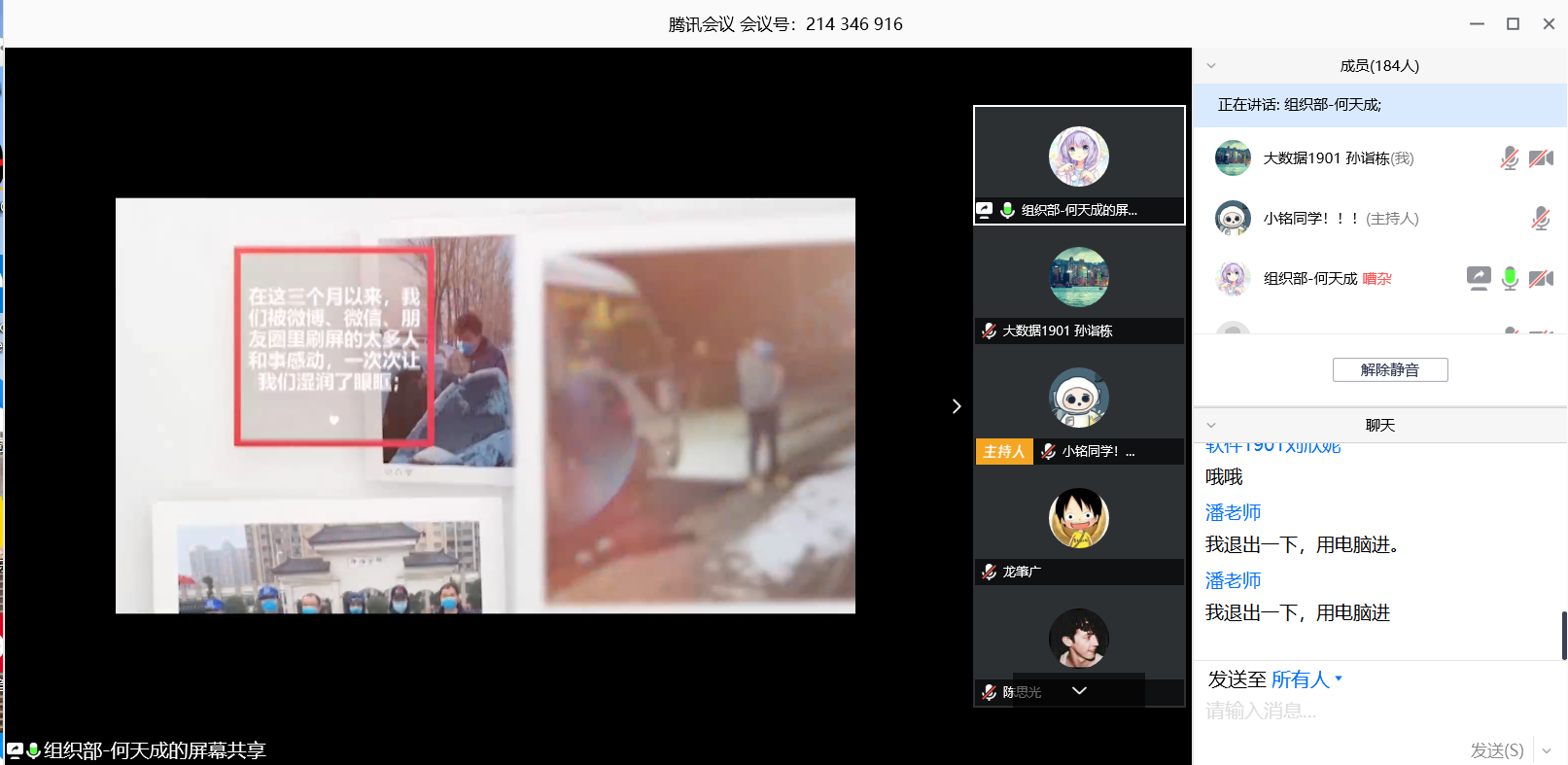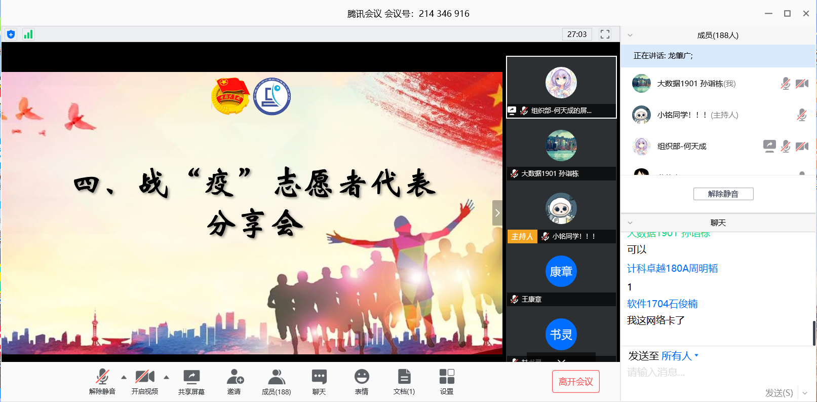 会上播放了计通学子在战疫一线志愿服务的视频,充分展示了计通人在战疫中绽放的“五四”青春。19级计卓团支部流畅等5位同学作了战疫志愿者代表分享,与同学们分享了自己的亲身经历和体验。计科1701团支部王思琪带领社团自发捐款、制作祝福武汉视频;软件1704团支部石俊楠发挥专业知识,助力当地信息化管理,进行入户信息摸排和信息录入;18计卓团支部周明涛组织全班在第一时间为武汉捐款捐物;计科1705甘书灵主动为小区采购捐赠40斤消毒液......计通防疫志愿者名单在会上通过共享屏幕展示,令全院学子备受感动。