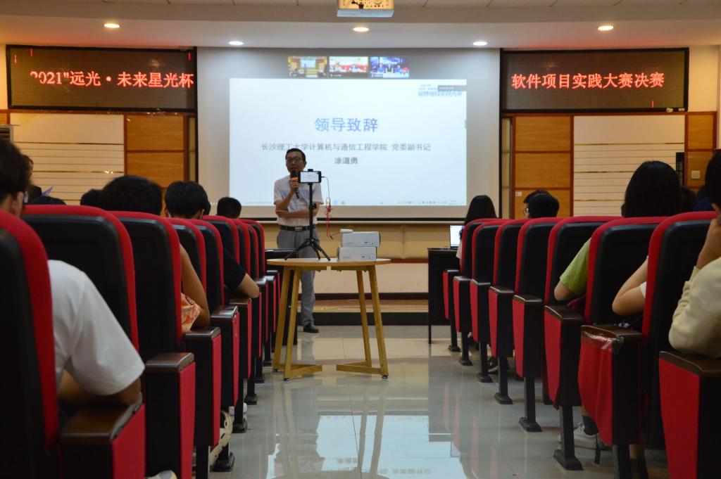 6月19日下午,计通学院2021年“远光·未来星光杯”软件项目实践大赛决赛在云塘校区理科楼B311顺利举行。本次比赛采用线上、线下相结合的方式开展,计通学院党委副书记涂道勇、软件工程系肖晓丽教授、网络工程系邓锬博士出席决赛。远光软件股份有限公司副总裁袁绣华、ECP平台研发部副总经理郭华、ECP平台研发部设计经理刘培德通过网络直播出席决赛。