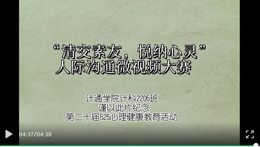 为了更好地帮助同学们培养良好的人际关系,我院在525期间组织举办了“清交素友,悦纳心灵”人际沟通微视频大赛,其中,我院计科2205班的卜子嫣导演的作品荣获校级二等奖。