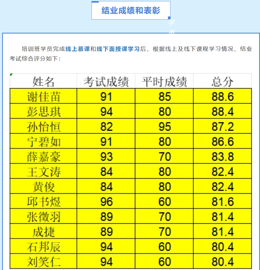 根据培训班培训班学员线上慕课和线下面授课学习情况,培训班评选出谢佳苗、彭思琪、孙怡恒、宁碧如、薛嘉豪、王文涛、黄俊、邱书煜、张徵羽、成捷、石邦辰、刘笑仁共12名同学为2023级朋辈心理互助培训班“优秀学员”。