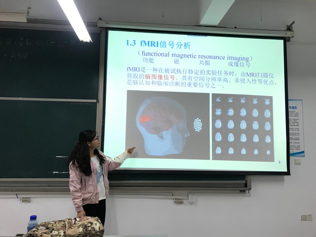 邝利丹博士首先从介绍了盲源分离典型的三大应用,即鸡尾酒会、胎儿心电信号估计和fMRI数据分析,重点科普了具有高空间分辨率且无侵入式的fMRI的相关知识;然后介绍了盲源分离的基本原理和两种常用盲源分离方法——信息最大化方法和快速定点独立成分分析,及其如何在fMRI数据中应用;最后介绍了近几年的盲源分离方法在fMRI数据中的研究进展。本次讲座在场学生纷纷感觉获益匪浅,不仅扩充了现有的知识面,同时感受了如何理论和实践相结合。