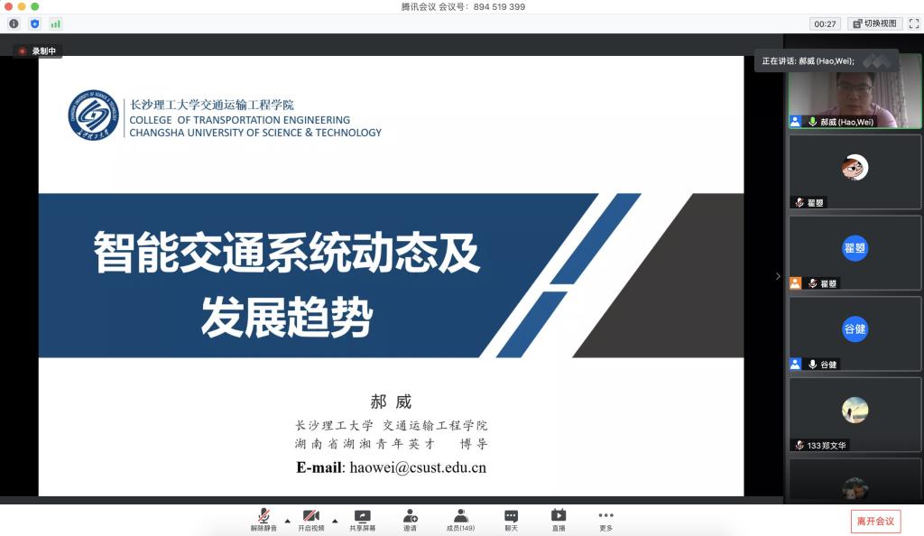 下午两点半,伟德betvlctor1946源于英国交通运输工程学院郝威教授结合其研究领域和方向,作了“智能交通系统动态及发展趋势”的主题授课。