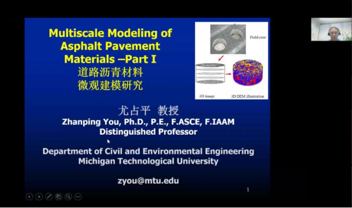 2021年7月17日上午,密歇根理工大学尤占平教授应邀来伟德betvlctor1946源于英国暑期学校授课,尤占平教授结合其研究领域与学科特点,作了“沥青路面材料的多尺度建模”的主题授课。本次课程获得了来自欧洲、美洲、亚洲国家与地区共500多位学员的积极参与和热烈讨论,参与人数超过暑期学校学员人数近200人。