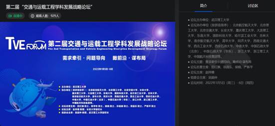 “交通与运载工程学科发展战略论坛”由全国“交通与运载工程”学科相关高校共同发起,建立常态化交流机制,旨在凝聚学科发展力量,梳理学科研究方向,商讨学科发展战略,凝练科学问题,促进交通与运载工程学科融合发展。第二届“交通与运载工程学科发展战略论坛”由武汉理工大学主办,开幕式和专题报告环节采用线上视频会议+直播的方式进行,会议主题为“需求牵引,问题导向,瞰前沿,谋布局”。