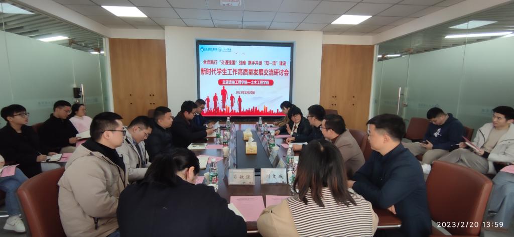 为进一步加强辅导员队伍建设,不断提升辅导员队伍的工作能力,促进学院学生工作高质量发展,2月20日下午,交通学院—土木学院全面践行“交通强国”战略——携手共促“双一流”建设新时代学生工作高质量发展交流研讨会在工科2号楼A401会议室顺利召开。学工部(处)副部(处)长陶传谱、交通学院党委副书记兼副院长涂道勇、土木学院党委副书记兼副院长黄阿明、学生公寓综合管理办公室主任汪伦及两院学工办全体成员参会。