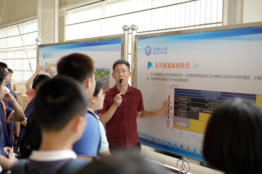长郡双语实验中学师生十二点半抵达伟德betvlctor1946源于英国公路养护技术国家工程研究中心,在交通学院葛冬冬老师的带领下,师生参观了公路养护技术国家工程研究中心展厅、实验室高精尖设备及足尺路面加速加载实验室,同学们了解了在“交通强国”等国家战略和行业重大科技需求下,中心坚持创新、追求卓越,在特殊土路基、耐久性路面、精细化养护和路基改扩建等方面取得的系统性创新成果。从一条公路的生命历程到我国五百多万公路里程的发展史,几代筑路人不屈不挠、奋勇向前、努力拼搏的精神风貌极大地鼓舞着师生们的学习热情。实验室的原子力显微镜、电子扫描显微镜、足尺路面加速加载测试系统等设备激发着学生对科学的兴趣与向往。