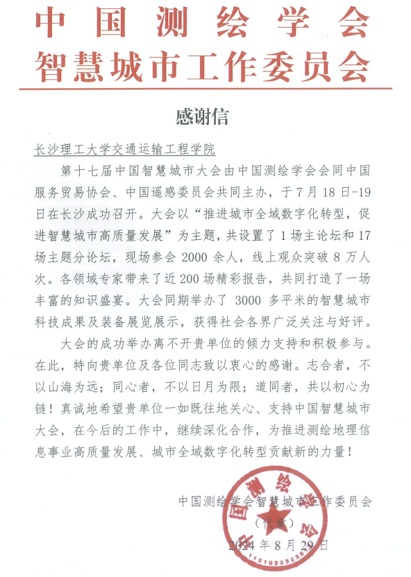 本次会议,测绘工程系教师积极参与会议组织工作,与同行专家就交通与测绘学科的交叉融合进行了深入交流。分论坛取得了圆满成功,扩大了交通运输工程学科的影响力,中国测绘学会智慧城市工作委员会给我院致感谢信。